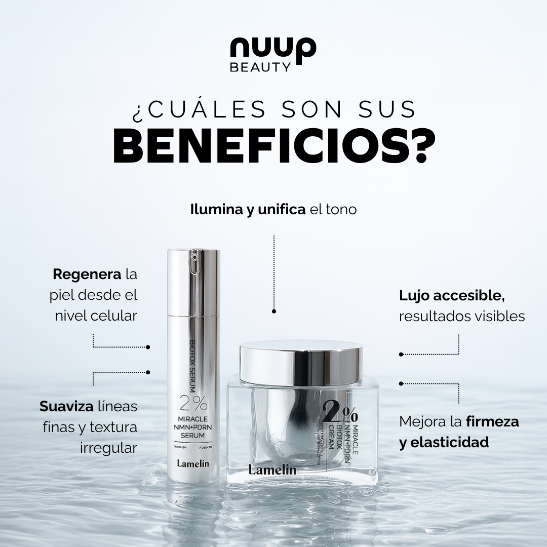Este suero innovador combina NMN (Nicotinamida Mononucleótido) y PDRN (Polideoxirribonucleótido) para ofrecer un potente tratamiento antienvejecimiento. El NMN es conocido por su capacidad para aumentar los niveles de NAD+ en las células, lo que promueve la renovación celular y mejora la vitalidad de la piel. Por otro lado, el PDRN, derivado del ADN de salmón, ayuda en la regeneración y reparación de la piel, proporcionando un efecto reparador.